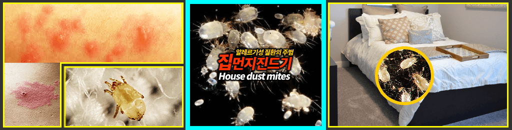 사실 집 먼지 진드기는 그 자체가 해로운 것은 아닙니다. 문제가 되는 것은 바로 배설물입니다. 배설물에는 ‘구아닌 (Gua nin)’이라는 특이 단백질 성분이 함유되어 있는데, 이 성분이 각종 알레르기 반응들을 불러일으킵니다. 특히, 이 배설물들이 먼지와 함께 공기 중을 떠돌아다니며 우리가 숨을 쉴 때 공기와 함께 흡입되어 코 점막을 자극하게 되는데, 이로 인해 ‘알레르기성 비염’ 증상을 나타나게 됩니다. 알레르기는 집 안의 작은 공기 입자에 대한 반응으로 발생하는 알레르기 질환입니다. 재채기, 콧물, 코막힘, 가려움증, 눈 충혈, 기침, 호흡곤란 등의 증상이 나타날 수 있으며, 천식이나 피부염과 같은 다른 알레르기성 질환의 증상도 악화시킬 수 있습니다.